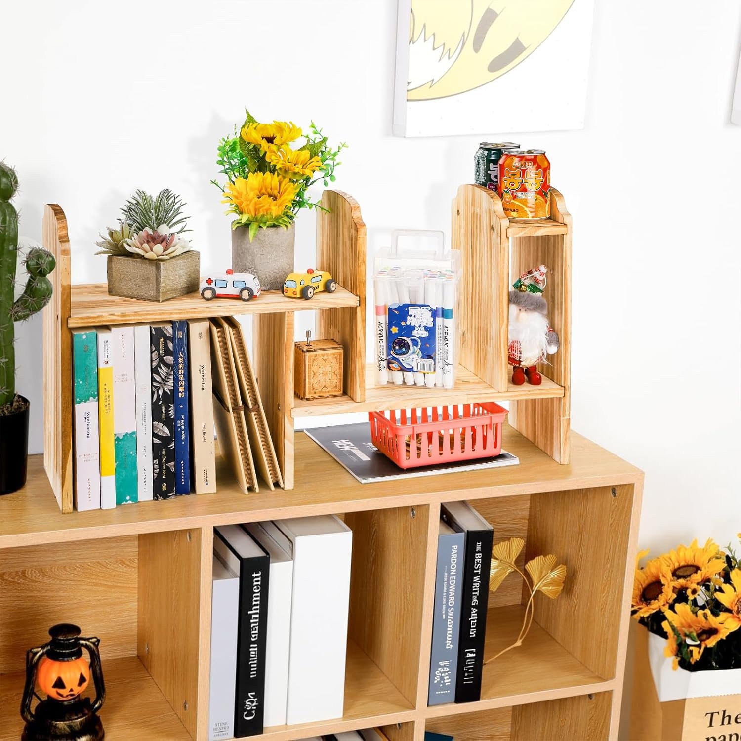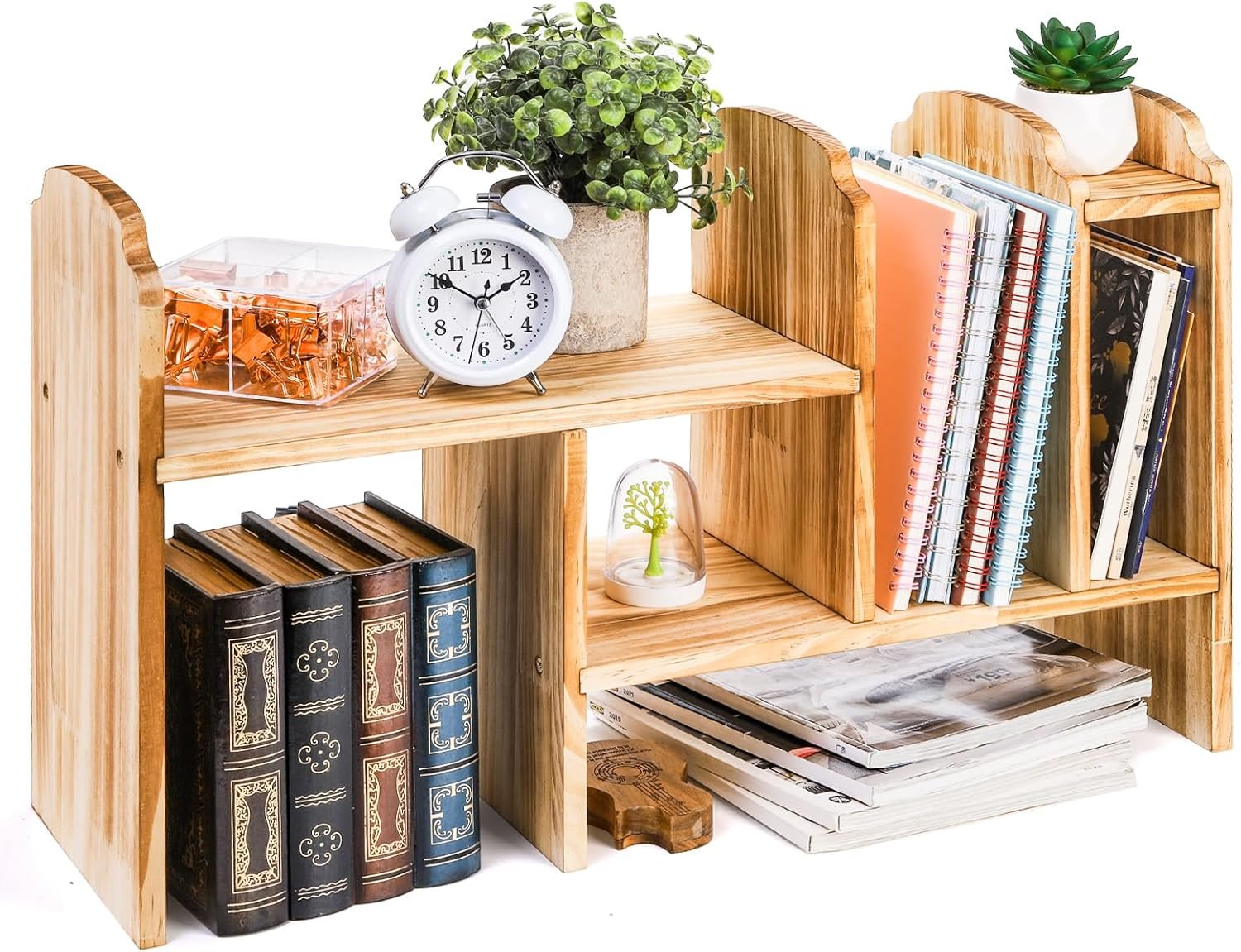 - Expandable Desk Organizer: The desktop bookcase is composed of two main parts, which can be close to be a small shelf rack, or further apart to be a longer shelf, meets your different storage needs.